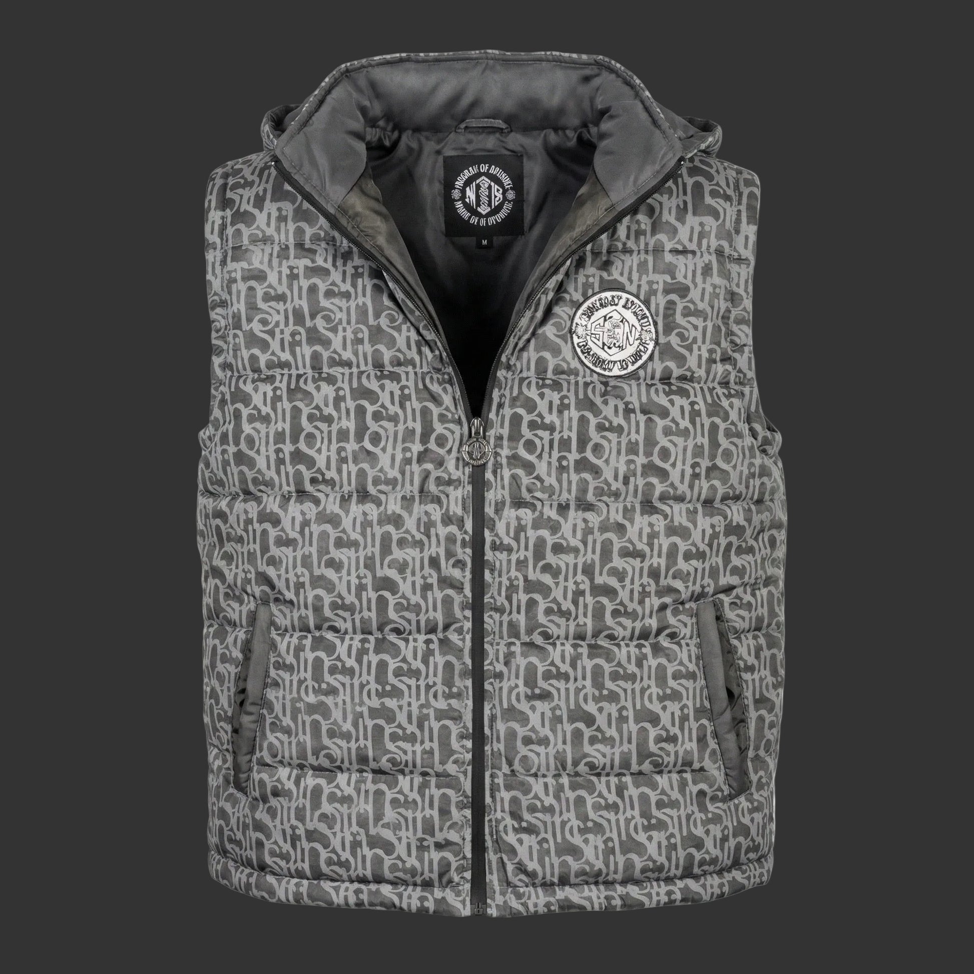 The "SIN BUBBIE VEST" blends high-fashion influence with meticulous craftsmanship, drawing inspiration from Dior while expressing our own creative identity. Designed with precision in every detail, it features our signature SIN MERCH logo embellished in the hood and placed boldly on the chest, delivering a refined yet powerful statement of modern luxury.
